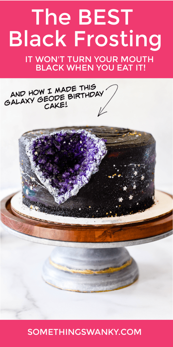 Black Frosting Recipe + Galaxy Geode Birthday Cake posted by Staff Writer Pin Share Tweet Email Jump to Recipe Finding the right Black Frosting Recipe can be tricky. Most recipes call for WAY too much black food coloring which will turn your mouth black and won’t taste very good. Or it doesn’t turn out black at all– just a bland, ugly gray instead. Looking for the perfect black frosting recipe? Look no further! This recipe is easy to follow and produces a delicious, jet-black frosting that will make your cake look out of this world! Galaxy geode cakes are all the rage right now, and with this frosting recipe, you can create one yourself in no time. When I made this Galaxy Geode Birthday Cake, I found the PERFECT recipe for black frosting. It won’t change the color of your mouth, tastes delicious, and is a deep, dark black color. Here’s What I used to Make this Cake: the black frosting recipe in this post vanilla buttercream for the filling a white cake recipe (I actually adapted this crazy cake recipe for three 8-inch layers) food coloring (purple, turquoise, pink, and black) silver edible paint sprinkles: black sanding sugar sprinkles, silver stars, and gold stars disco dust purple rock candy Black Frosting Ingredients 2 cups butter, softened 5 cups powdered sugar 1 cup DARK chocolate cocoa powder (or premium black cocoa powder) 3/4 cup hot water 2 tsp vanilla extract 8 ounces dark chocolate 2-3 tsp black gel food coloring How to Make this Black Frosting Recipe 1. In a stand mixer, beat the butter with a paddle attachment for 2 minutes. 2. In a small mixing bowl, mix together the hot water and the cocoa powder. It will form a thick paste. Set aside. 3. In another bowl, melt the chocolate chips. Let cool slightly before mixing the chocolate into the butter. Beat on medium-high speed and scrape down the sides as needed. 4. Add the chocolate paste, vanilla, and 1 cup of powdered sugar. Mix well, scraping down the sides as needed. 5. Gradually mix in the rest of the powdered sugar, scraping down the sides as needed. 6. Mix in the black food coloring. Note: IT WILL NOT LOOK SOLID BLACK YET. The color will need to develop over a few hours, so cover the bowl and let it rest. General Steps to Make Galaxy Geode Cake I didn’t have the time to take step-by-step photos or make a video for an in-depth tutorial for this cake, but I’m going to list the general steps here and do my best to highlight the steps in the photos below. 1. Bake three 8-inch round cakes, and let cool completely. 2. Reserve 1/2 cup of frosting. Fill the cake layers with remaining vanilla frosting and cover with a crumb coat. Chill the cake in the freezer for about 30 minutes. 3. Color 1/4 of the reserved frosting with purple. Divide the remaining frosting into two bowls and color them with the turquoise and the pink colorings. Cover the bowls and set aside. 4. Frost the cake with the black frosting. The video below shows step-by-step beginner instructions for frosting a cake and getting smooth edges. Add small “globs” of pink, purple, and turquoise frosting around the cake before smoothing to create a “galaxy” look. 5. Cut a gash in the cake. It doesn’t have to be perfect! 6. Spread purple frosting inside the gash. Gently press rock candy pieces into the purple frosting. Food tweezers help! 7. Paint the edges of the rock candy with the silver edible paint. 8. Splatter silver paint all over the cake. Add star sprinkles and disco dust. With this black frosting recipe, you can create a delicious and impressive galaxy geode cake that will wow your friends and family. Be sure to mix the frosting well after adding the cocoa powder, and adjust the consistency as needed depending on what type of cake you are using it for. Happy baking! 🙂 Black Frosting Tips: The frosting recipe above will work for most cakes, but you may need to adjust the amount of milk depending on the consistency you are going for. If you want a thicker frosting, add less milk. For a looser frosting, add more milk. Be sure to mix the frosting well after adding the cocoa powder. This will help to prevent any clumps from forming. Frost your cake using a piping bag and tip of your choice, or simply use a butter knife to spread it on. Enjoy! 🙂 Geode Cake Tips: For a galaxy geode cake, we recommend using a light blue frosting as the “sky” and adding different shades of purple, pink, and white frosting for the stars. You can either use store-bought frosting or make your own with our recipe below. To create the effect of a real geode, use a variety of different colored frostings and sprinkles to decorate your cake. To make the stars on your galaxy geode cake, we recommend using a star-shaped piping tip. You can find this tip at most craft stores or online. Continue to Content Black Frosting Recipe Yield: 16 servings Prep Time: 20 minutes Additional Time: 3 seconds Total Time: 20 minutes 3 seconds When I made this Galaxy Geode Birthday Cake, I found the PERFECT recipe for black frosting. It won't change the color of your mouth, tastes delicious, and is a deep, dark black color. Print Ingredients 2 cups butter, softened 5 cups powdered sugar 1 cup DARK chocolate cocoa powder (or premium black cocoa powder) 3/4 cup hot water 2 tsp vanilla extract 8 ounces dark chocolate 2-3 tsp black gel food coloring Instructions In a stand mixer, beat the butter with a paddle attachment for 2 minutes.In a small mixing bowl, mix together the hot water and the cocoa powder. It will form a thick paste. Set aside.In another bowl, melt the chocolate chips. Let cool slightly before mixing the chocolate into the butter. Beat on medium-high speed and scrape down the sides as needed.Add the chocolate paste, vanilla, and 1 cup of powdered sugar. Mix well, scraping down the sides as needed.Gradually mix in the rest of the powdered sugar, scraping down the sides as needed.Mix in the black food coloring. Note: IT WILL NOT LOOK SOLID BLACK YET. The color will need to dev