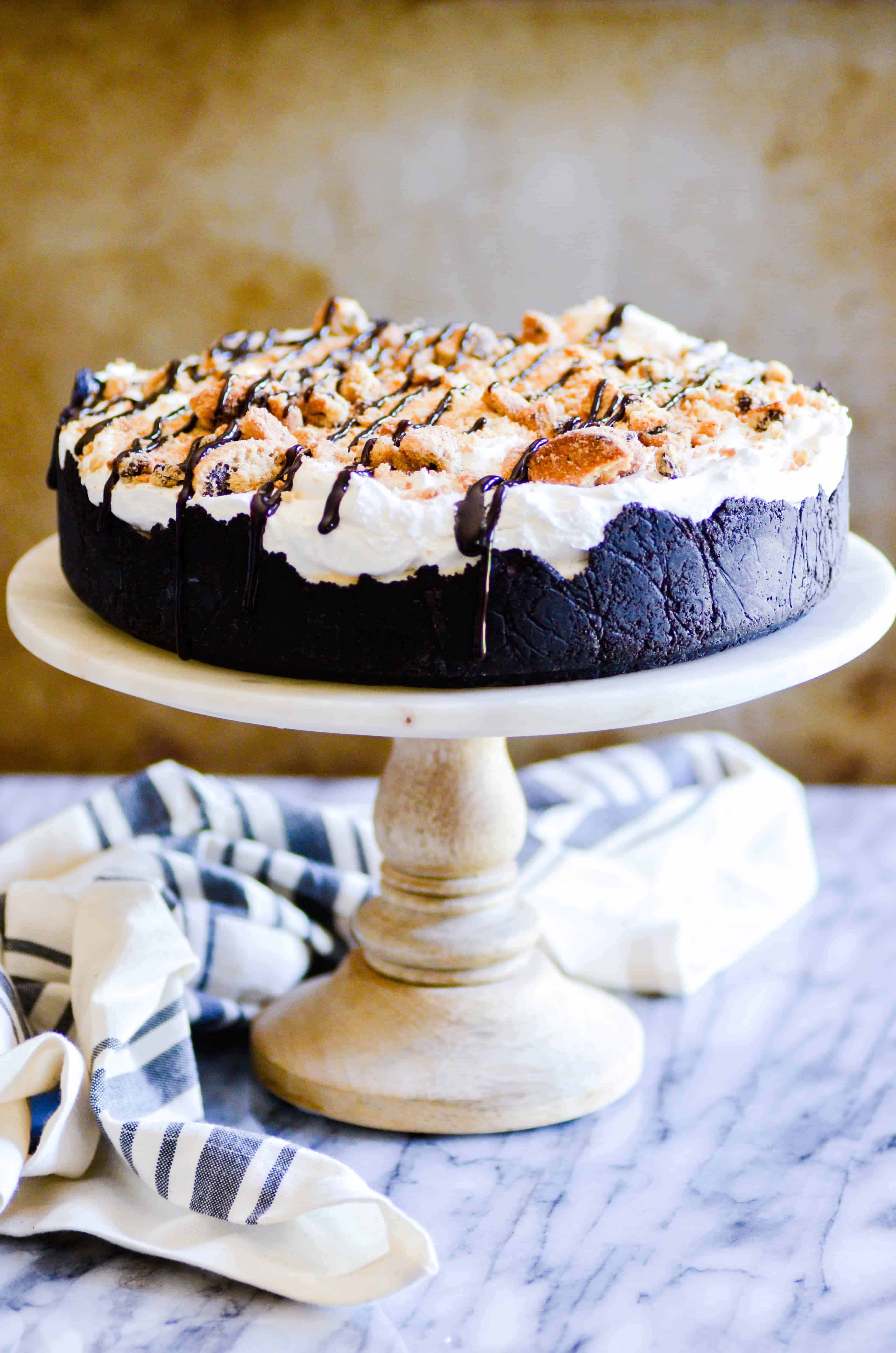 No Bake Deep Dish Cookies & Milk Pie Recipe posted by Staff Writer Pin Share Tweet Email Jump to Recipe Seven layers of chocolate chip cookies and whipped cream piled into a Deep Dish Oreo crust. No need to break a sweat with this dreamy No Bake Deep Dish Cookies & Milk Pie– it’s so easy! I LIVE for quick and easy recipes. Between working from home, mom-ing, and always trying to cram too much of everything else into every day too, I am always short on time. And while I’ll always appreciate a loaf of mom’s homemade bread, impressive layer cakes made entirely from scratch, and a chocolate cream pie that skips the pudding mix, nothing speaks to my heart quite like a quick-and-easy-no-bake recipe! So for all my readers out there who also live life running 15 minutes behind with unwashed hair and a sink full of dishes… this one’s for you ????. Which recipes do you like best: NO BAKE or FROM SCRATCH? Tell me on FB! This No Bake Cookies & Milk Pie comes together in just a few minutes. You could even use a pre-made crust! A FEW THINGS TO NOTE ABOUT THIS RECIPE: I added a little extra Cool Whip and some additional cookies to the top of the pie for garnish. Please note– the recipe below does not include those additions!! If you want to make your pie look exactly like mine, you’ll need to buy additional cookies (the recipe calls for an entire package of Chips Ahoy-style cookies) and you’ll need to buy additional Cool Whip (the recipe calls for an entire 8 oz. container of Cool Whip).I drizzled my homemade chocolate syrup over the pie as an afterthought, mostly for looks. But my taste testers and I all felt that the chocolate syrup really made the pie (which was surprising, because it’s just a little drizzle). So don’t skip it!I used my favorite Oreo crust as the base of this pie, and it’s really easy to make. But if you need something even faster and easier, go ahead and use a store-bough chocolate graham cracker crust.I like to make these types of pies in a springform pan, just because I like the way it looks. But you can most definitely make this in a deep pie dish. Continue to Content No Bake Cookies & Milk Pie Yield: 16 servings Seven layers of chocolate chip cookies and whipped cream piled into an Oreo crust. No need to break a sweat with this dreamy No Bake Milk & Cookies Pie-- it's so easy! Print Ingredients FOR THE OREO CRUST 1 package Oreo cookies (about 36) 8 tbsp butter FOR THE FILLING 13 ounce package of chocolate chip cookies (like Chips Ahoy) 8 ounces Cool Whip 1½ cups of milk GARNISH Additional Cool Whip and crumbled chocolate chip cookies chocolate syrup to drizzle Instructions PREPARE THE CRUST. Crush the Oreos into fine crumbs in a gallon sized ziptop bag using a kitchen mallet or rolling pin. Place the butter inside the bag and microwave for 30 seconds (make sure the bag is right side up). Press all the air out of the bag and zip it shut. Smush the cookie crumbs and butter together inside of the bag until mixed well. Firmly press the Oreo mixture into a pie dish or springform pan. ADD THE FILLING Dunk each chocolate chip cookie in milk and layer evenly over the Oreo crust (I fit about 8-10 cookies on each layer). Spread ¼ of the Cool Whip over the cookie layer. Repeat twice more with the cookie layers and end with a final layer of Cool Whip. Garnish as desired. Freeze until ready to serve (let thaw at room temperature for about 10 minutes before cutting). Notes NUTRITION INFORMATION: calories 300 Total Fat 17 g Saturated Fat 8 g Total Carbohydrate 36 g Dietary Fiber 1 g Sugars 19 g Protein 3 g Want more No Bake?? I’ve gotcha covered. CHECK OUT MY FAVORITE NO BAKE RECIPES: Homemade Chocolate Syrup Peanut Butter Oreo Icebox Cake Monster Cookie Dough Dip (The Original Recipe) 1 YEAR AGO: HOMEMADE HORCHATA 2 YEARS AGO: WHITE CHOCOLATE SNICKERDOODLE MOUSSE 3 YEARS AGO: 15 SUMMER-TASTIC ALL-AMERICAN DESSERTS 4 YEARS AGO: CHERRY COKE JELLO 5 YEARS AGO: OOEY GOOEY S’MORES BUTTER COOKIES 6 YEARS AGO: DESSERT CRESCENT ROLLS 7 YEARS AGO: CHOCOLATE BREAD PUDDING WITH BUTTERSCOTCH GANACHE