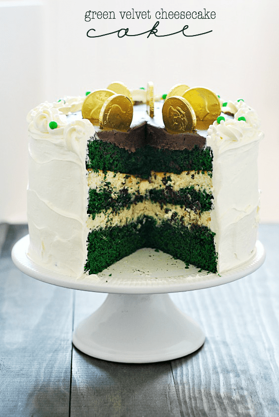Green Velvet Cheesecake Cake Recipe posted by Staff Writer Pin Share Tweet Email Jump to Recipe If you’ve been following along, you know that I’m in the middle of a series of posts inspired by Girl Scout Cookies. But if it’s okay with you, I’d like to throw in an extra post here and there for St. Patrick’s day. I don’t have all that much to contribute to the holiday really (with the exception of everything Thin Mint-y and green from last week… and this awesome St. Patrick’s Day Dessert Collection), but I have created two pretty exceptionally awesome desserts for St. Patty’s that I’d love to share with you in between Samoas and Tagalongs! The green velvet cake I used here is simply my Great-Grandmother’s red velvet cake that I shared in February, using green food coloring instead of red, obviously. The cheesecake filling is also a recipe I’ve shared here before– my Favorite Cheesecake. I used Cool Whip Frosting (different than plain ol’ Cool Whip) to frost the cake, because it’s a personal favorite of mine. And then I topped the whole thing with an Irish Cream Chocolate Ganache. Preeeeeety delish. ย I will go ahead and warn you of one change I’d make if I were to make this cake all over again (which I probably will… like tomorrow): I would have gone for fewer layers– 2 cake layers and 1 cheesecake layers. It would have been easier (obviously), and I think more visually appealing. Plus, you’d get a bigger bite of cheesecake in one forkful. I’ve seen other bloggers make cheesecake cakes in this way, and now it makes total sense. So… save yourself some time and effort– just go for the easy 3 layers! Continue to Content Green Velvet Cheesecake Cake Yield: 8-12 Print Ingredients 1 recipe Red Velvet Cake (using green food coloring instead of red, omit frosting portion), baked in 2 9-inch rounds 1 recipe Favorite Cheesecake, baked in 9-inch round, omit crust 2 - 10.6 ounce containers Cream Cheese Cool Whip Frosting 2 cups semi-sweet chocolate chips 3/4 cup Irish Cream creamer Instructions Bake and cool the red (green) velvet cake and cheesecake according to recipe directions. Remember-- no need to make the frosting for the red velvet cake OR the graham cracker crust for the cheesecake. Simply bake the cheesecake in a lined 9-inch round cake pan. Once cooled, layer the 3 cakes alternately (green velvet, cheesecake, green velvet) on cake plate/stand. Frost with Cool Whip Frosting around the sides, but not on the top. Chill cake in the refrigerator while making the ganache (in the following step). Place the semi-sweet chocolate chips and the creamer in a medium microwave-safe bowl. Microwave for 1 minute. Stir chocolate until melted and combined with creamer (I like to use a whisk, but beware this causes air bubbles in the ganache, disrupting a smooth look). If necessary, heat for another 30 seconds to melt chocolate completely. Allow the ganache to cool for 30 minutes and then spread over top of the cake. Allow cake to chill for at least 3 hours before serving. Don’t miss a bite! Connect with Something Swanky: Take a peek at some of the recipes mentioned in this post: