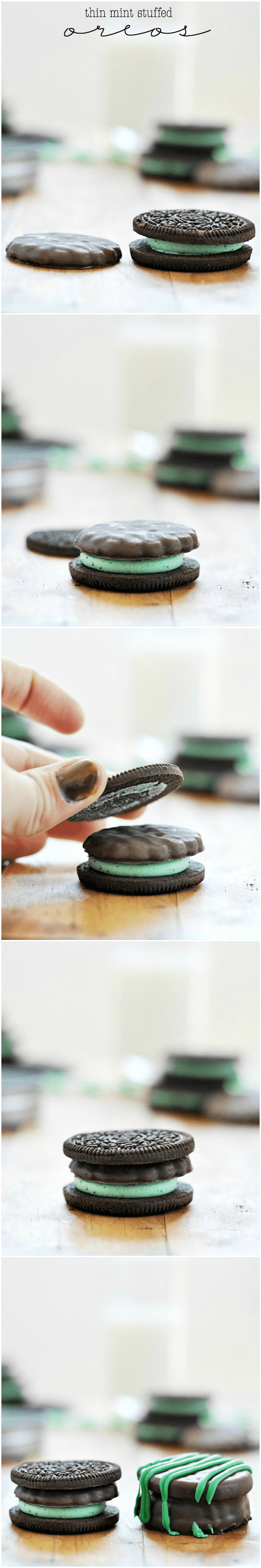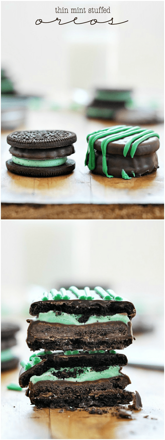 Thin Mint Stuffed Oreos + Thin Mint Printable Recipe posted by Staff Writer Pin Share Tweet Email Jump to RecipeThis is post #3 in a 3 week series of Girl Scout Cookie-inspired recipes! Click here to view all of the recipes in this series Just a heads up… I took like a million pictures of these bad boys. And had a really hard time narrowing down which ones to share. So…. they’re all here. I tried to condense them into collages, but I’m not sure that really does much to help the overwhelming amount of photos. So that’s that. But really, there’s just one overriding message that all these pictures are trying to convey: I stuffed a mint Oreo with a Thin Mint and dipped in in chocolate. Bam. Also– I have this awesome friend who happens to be a whiz with designs. She makes all sorts of things pretty, and I was thinking it would be a lot of fun to incorporate some Girl Scout Cookie-themed printables in this series. So I asked Meg, who blogs at Big Red Clifford, to hook me up with some of her suh-weet designs, and she didn’t disappoint! Just look at these super cute “minty” tags sheΒ made: Seriously, these Oreos are perfect for wrapping up and giving away. So… you know… do that! Continue to Content Thin Mint Stuffed Oreos + Thin Mint Printable Print Ingredients Oreos (Mint is ideal, but not absolutely necessary) Thin Mints melting chocolate candy optional: melting green candy for drizzle Instructions Split each Oreo in half and place a Thin Mint in between the layers. Melt the chocolate melting candy according to the manufacturer's instructions. Place each stuffed Oreo in the melted chocolate, and use a fork to push some chocolate over the top. Use the fork to lift the stuffed cookie out of the chocolate and gently tap on the edge of the bowl to let the excess drip off. Slide the cookie onto parchment paper, wax paper, or foil to allow chocolate to harden before serving or packaging. Don’t miss a bite! Connect with Something Swanky: Be sure to pin my favorite Oreo recipes!