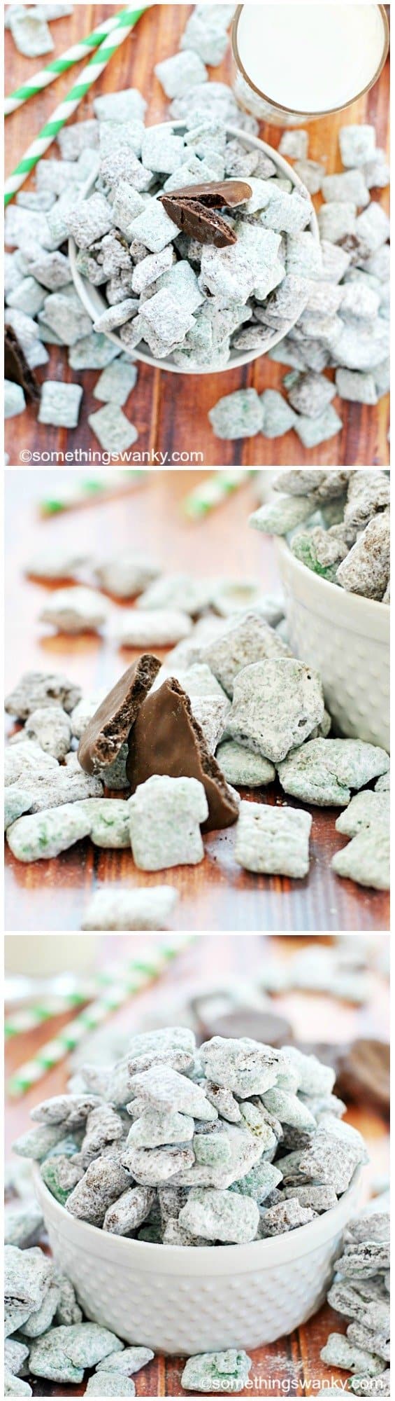 Thin Mint Muddy Buddies Recipe posted by Staff Writer Pin Share Tweet Email Jump to Recipe This is post #1 in a 3 week series of Girl Scout Cookie-inspired recipes! Click here to view all of our Girl Scout cookie recipes. A couple of years ago, in my earlier days of full-time blogging, I posted a 3 week series of Girl Scout Cookies-inspired recipes. I dedicated a full week each to Thin Mint recipes, Samoas recipes, and Tagalong recipes. I chose those, because they are my favorite three cookies, and after some light polling in 2012, I discovered they’re widely considered the top three faves, and that’s good enough intel for me ๐ I enjoyed creating the series so much back then that I’ve decided to bring it back bigger and better in 2014!! Over the next three weeks I’ll be posting 4 Girl Scout Cookie-themed recipes each week. Some recipes will use actual GS cookies (or Keebler brand substitutions). Some recipes won’t use the cookies at all but will, instead, be inspired by the flavors and textures of the particular cookie. Thin Mints are up first! Partly because they’re my numero uno FAVE (especially frozen)! And partly because minty green fits in so well with St. Patrick’s day. Delicious multi-tasking ๐ Speaking of delicious… these Thin Mint Muddy Buddies are fabulous. They are minty and chocolatey, chock full of crunchy thin mints, and beautifully green!! This two-toned snack mix comes together in minutes and it ready to serve up and enjoy right away. Continue to Content Thin Mint Muddy Buddies Print Ingredients 1 1/2 cups mint chips* 1 1/2 cups milk chocolate or semi-sweet chocolate chips 9 cups rice Chex cereal, divided 1 box Thin Mints or Keebler's Fudge Mint Cookies, chopped, divided 3 cups powdered sugar, divided Instructions Prepare two gallon sized zip top bags by filling them each with 1 1/2 cups of the powdered sugar. Set aside. In a large microwave-safe mixing bowl, melt the green chips by microwaving for 1-2 minutes (In 30-second intervals, stirring in between). Use a large rubber spatula to gently mix in 4 1/2 cups of the Chex cereal and half of the cookie pieces. Spoon the mint chocolate covered pieces into one of the zip top bags. Seal the bag and shake to coat the pieces. Pour into a large serving bowl, and set aside. In the (same) large microwave-safe mixing bowl, melt the chocolate chips by microwaving for 1-2 minutes (In 30-second intervals, stirring in between). Use a large rubber spatula to gently mix in the remaining cereal and cookie pieces. Spoon the chocolate covered pieces into remaining zip top bag. Seal the bag and shake to coat the pieces. Pour into the large serving bowl with the minty pieces. Gently mix together and serve. Store in an airtight container for up to a week. Notes *Hershey's, Guittard, Wilton's, or plain green Wilton's + mint candy flavoring Don’t miss a bite! Connect with Something Swanky: Be sure to Pin these other Thin Mint recipes! Check out these Thin Mint recipes from my friends: Thin Mint Mini Pies Chocolate Thin Mint Ice Cream Deep Dish Thin Mint Chocolate Chip Cookies