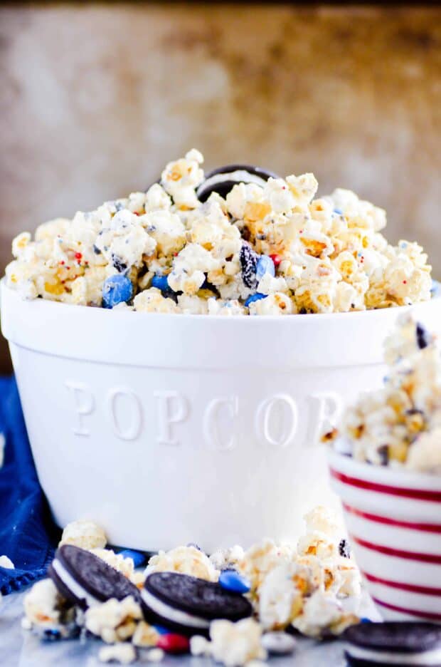 Firecracker Popcorn Chow posted by Staff Writer Pin Share Tweet Email Jump to Recipe White chocolate coated kettle corn, M&MS, and Firecracker Oreos come together in just a few minutes to make this Firecracker Popcorn Chow. Perfect for the 4th of July! This Firecracker Popcorn Chow takes 15 minutes and 4 simple ingredients. RECIPE OVERVIEW: Melt the white chocolate in a large bowl. Add the kettle corn, Oreos, and M&MS to the bowl. Mix it all up. Spread it out and let it harden. Voila! A FEW THINGS TO NOTE ABOUT THIS RECIPE: You could use regular popcorn in a pinch, but I really prefer using kettle corn for a candy coated popcorn mix. Even though I use a melting chocolate candy (more on that in the next bullet point) designed for coating, there’s still enough moisture in it to make the popcorn a little less crisp than I’d like it. It also shortens the shelf life quite a bit to use regular popcorn instead of kettle corn. The sugar coating on kettle corn keeps it crisp and crunchy for a while! I usually use Boom Chicka Pop kettle corn, because it’s easy! But you could also make your own Kettle Corn at home! I always use melting candy (like Wilton’s or Ghirardelli) for any recipes that involve coating something in chocolate. It melts easily with a low risk of seizing or burning, coats evenly, hardens quickly, and doesn’t melt immediately in your hands. You can generally find this kind of melting candy at Target (Ghirardelli), Walmart (Wilton’s and/or Ghirardelli), and Michaels or other craft stores (Wilton’s). Be sure to spread the popcorn out on a nonstick surface like parchment paper or a silicone mat. This will make it much easier to transfer to a serving bowl or into gift bags. Continue to Content Firecracker Popcorn Chow Yield: 6-8 servings Prep Time: 10 minutes Total Time: 10 minutes White chocolate coated kettle corn, M&MS, and Firecracker Oreos come together in just a few minutes to make this Firecracker Popcorn Chow. Perfect for the 4th of July! Print Ingredients 10 cups kettle corn 10-12 ounces white chocolate candy melts 1 cup crumbled Firecracker Oreos 2 cups Red, White, and Blue M&Ms Instructions Place kettle corn in a large bowl. Be sure to remove any unpopped kernels! Add the crumbled Oreos and M&Ms to the bowl as well. Melt the white chocolate melting candy according to the directions on the package. Stir until smooth and pour over the popcorn mixture. Gently stir with a spatula to mix and coat everything in the candy coating. Spread the popcorn on a large sheet of parchment or a silicone baking mat. Let cool for 10-15 minutes to dry and harden before serving or packaging. Notes NUTRITION INFORMATION: CALORIES 636 | TOTAL FAT 35 G | SATURATED FAT 21 G | TOTAL CARBOHYDRATE 75 G | DIETARY FIBER 3 G | SUGARS 61 G | PROTEIN 6 G Nutrition information is approximated based on 8 servings. I calculated for 10 Oreos instead of 1 cup. Looking for more patriotic recipes?! Right this way. CHECK OUT THESE RED, WHITE, AND BLUE TREATS! Red, White, and Blueberry Cheesecake Trifle 4th of July Fruit Pizza Red Velvet Cookie Bars with Cream Cheese Frosting 4th of July Piñata Cake