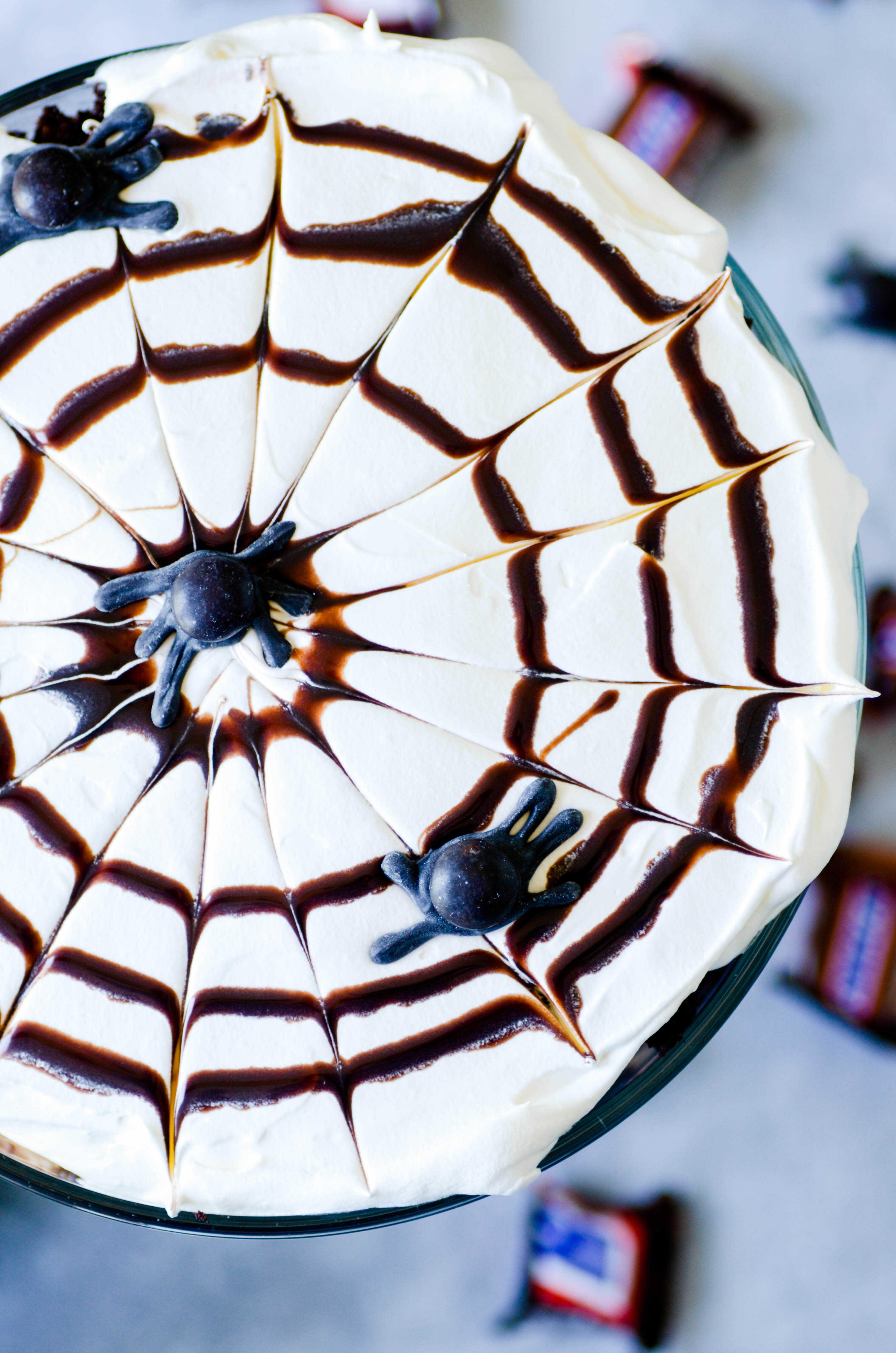 SNICKERS® BAR Halloween Trifle Recipe posted by Staff Writer Pin Share Tweet Email Jump to Recipe This post has been sponsored by Mars Wrigley Confectionery US, LLC. All thoughts and opinions are my own. Layers of cake, pudding, whipped cream, and snickers come together in a simple and delicious dessert topped with a chocolate syrup spider web. This Snickers Trifle is perfect for this season’s Halloween parties and spooky gatherings! DON’T MISS MY FAVORITE HALLOWEEN RECIPES ON FACEBOOK! Ohhhh, my friends. It’s ALMOST here! Can’t you just feel it in the air?! The most glorious part of the entire year: the BEGINNING of the holiday season. And isn’t Halloween just the best holiday to start with? What better way to kick off three months filled with good eats and pretty treats than with a holiday that is 10000000% centered around candy! It’s like the perfect “gateway” holiday. It’s all fun and games and SNICKERS® bars without any of the stress that comes with the gift-giving, giant-meal-making, and extended-family-ing you’ll have to deal with in another month. And I’ve got THE BEST Halloween recipe to share with you today. It combines my two great Halloween loves: Fun Size SNICKERS® candies from Walmart + food with spider webs on it ????????. Ingredients for SNICKERS® BAR HALLOWEEN TRIFLE HAS EVERYTHING YOU NEED TO MAKE IT! chocolate cake mix (plus ingredients on the back of the box) whipped topping instant pudding mix (chocolate!) milk Fun Size SNICKERS® candies chocolate syrup My already has the big bags of Mars Seasonal Halloween Candies right up front, and I’ll bet yours does too. Just toss a couple of bags right on into the cart next time you’re making a grocery run! Because, let’s be real– when do you NOT need a giant bag of mixed chocolate candies (and let’s not forget SKITTLES®) during the month of October?! How to make a SNICKERS® BAR Halloween Trifle Bake a chocolate cake. Cut it into bite sized pieces once cooled. Chop SNICKERS® bars minis into quarters. Alternate layers of the candy, cake, chocolate pudding, and whipped topping in a trifle dish. How to make the spider web on top Spread the whipped topping out evenly on top of the trifle. Draw circles (like a bullseye) with chocolate syrup on top. Drag a toothpick from the center circle outward repeatedly to create a spider-web look. Continue to Content SNICKERS Halloween Trifle Yield: 12 Prep Time: 30 minutes Cook Time: 30 minutes Total Time: 1 hour Layers of cake, pudding, whipped cream, and snickers come together in a simple and delicious dessert topped with a chocolate syrup spider web. This Snickers Trifle is perfect for this season's Halloween parties and spooky gatherings! Print Ingredients 1 chocolate cake, baked and cooled (from scratch or a box mix) 3/4 oz. chocolate instant pudding mix 2 cups skim milk 16 oz. whipped topping 2 cups SNICKERS® bars minis, chopped chocolate syrup Instructions Cut up the chocolate cake into bite sized pieces in the pan. Set aside. Whisk together the pudding mix and skim milk until thickened. Place 1/3 of the cake pieces in the bottom of a trifle dish. Layer about 1/3 of the candy pieces on top of the cake. Spread 1/3 of the pudding over top. Spread 1/3 of the whipped topping on top of the pudding. Repeat for 3 layers. Follow directions in the post and the video for creating a spider web on top with chocolate syrup. Chill for at a least an hour before serving.