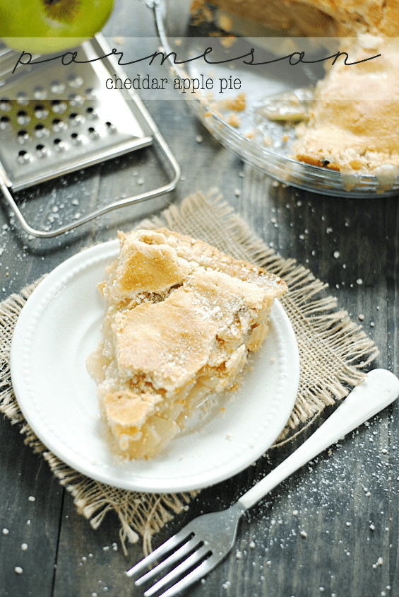 Parmesan Cheddar Apple Pie posted by Staff Writer Pin Share Tweet Email Jump to RecipeThis post is sponsored by Mama Francesca. Find my Disclosure Policy here. A couple of weeks ago I made this Blackberry Brie Pizza. Remember? Even though you didn’t ask me to, I chronicled the moments in my life that led to my love affair of pairing cheese with something sweet (because I’m sure you needed all those details). Anyway. One of those moments was discovering how incredibly delicious it is to eat a melt-y slice of sharp cheddar cheese on a piece of day-old apple pie. And since I’ve been working on recipe development using Mama Francesca premium Parmesan cheese, it occurred to me that Parmesan cheese might also be a tasty addition to my cheese-y apple pie, thus the Parmesan Cheddar Apple Pie! How Did That Parmesan Cheddar Apple Pie Come Out? And guess what– it totally was. The sharpness of the cheddar and Parmesan really pairs so well with the sweetness of the apples and the buttery, flaky pie crust (which has both cheeses baked right into it)! Almost like a sweet & salty thing. I know you might have to take a leap of faith and trust me to put a little cheese into your pie, but it’s so worth it! It’s like the most comforting comfort food you’ve ever shoveled in your mouth. Cheese + Pie = uh, more please? One thing to note: I know I said this last time, but it bears repeating: when you’re putting cheese into a dessert, quality counts! is a premium grated cheese and tastes delicious in this apple pie! Continue to Content Parmesan Cheddar Apple Pie & Mama Francesca Parmesan Cheese Yield: 8-12 servings Print Ingredients For the Pie Crust:* 2 cups all-purpose flour 1 tsp salt 2/3 cup shortening 3 tbsp cold butter 2 tsp vegetable oil 1/3 cup buttermilk 2 tbsp Mama Francesca Parmesan cheese 2 slices sharp cheddar cheese For the filling: 1/2 cup sugar 1/4 cup all-purpose flour 3/4 tsp ground cinnamon 1/4 tsp nutmeg 6 cups thinly sliced, peeled Granny Smith apples 2 slices sharp cheddar cheese 2 tbsp Mama Francesca Parmesan cheese 2 tbsp cold butter 2 tsp water 1 tbsp sugar Instructions For the crust: Reserve both the Parmesan and cheddar cheese and combine all other ingredients in a food processor until a "thick" crumbly mixture forms. Add the cheese slices and Parmesan and process for a few seconds more, allowing the cheese to be mixed in to the dough but not completely incorporated. Turn the dough (it's okay if it's a pile of thick crumbs) out onto a (preferably non-stick) work space**. Do not add flour. Use light cooking spray if necessary to prep the space. Work dough into one large ball. Divide it evenly into two balls. Roll each ball out into a pie crust. Use one to line a deep dish pie dish immediately, cover and refrigerate. Roll the other around a rolling pin. Wrap in plastic and refrigerate while mixing the filling. For the filling: Preheat the oven to 425ºF. In a gallon sized ziptop bag, add the 1/2 cup sugar, flour, cinnamon, and nutmeg. Seal bag and shake to mix. Add the apples to the bag. Seal and shake well to coat the apples evenly. Pour apples into the pie crust-lined pie dish. Tear the slices of cheddar cheese into large pieces and place on top of the apples. Sprinkle the Parmesan over the apples. Cut butter into small pieces and "sprinkle" over the cheese and apples. Unroll the second pie crust over the apple and cheese filling. Press the edges of the two pie crusts together to seal. Cut 4 small slits into the top of the pie. Brush the water over top of the pie crust and sprinkle with 1 tbsp of sugar. Bake for 45-50 minutes until crust is golden brown and filling is bubbling. Let cool for at least an hour before serving. Notes *Feel free to use 2 refrigerated pie crusts instead if you don't mind forgoing the extra cheese I add to my homemade crust. **I use a Roul'pat. Mama Francesca premium grated Parmesan cheese comes in a variety of flavors and can be found at Wal-Mart. Be on the look out for their brand new three-cheese flavor, Terzetto, in Wal-Mart stores beginning on April 21!