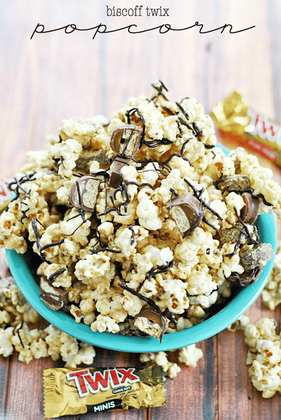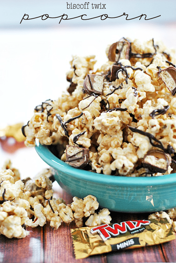 Biscoff Twix Popcorn Recipe posted by Staff Writer Pin Share Tweet Email Jump to Recipe Not too long ago, I posted a recipe for Peanut Butter Snickers Popcorn. A friend of mine mentioned her peanut allergy and said, “darn. Can’t eat it!” For a moment, I was baffled. Not because of the peanut allergy. But because I genuinely failed to see the problem– about 900 substitutions for the peanut butter and snickers had already run through my mind! Obviously the phrase “I can’t eat that” is not in my vocabulary. So here we are. The first of 900 alternate recipes to that Peanut Butter Snickers Popcorn… 899 to go! The Biscoff (or Speculoos Cookie Butter, whichever) and the Twix harmonize in a beautifully delicious way. This definitely ranks as one of my favorite popcorn recipes to date!!! And I’ve been around the block a few times with the popcorn bowl, so when I dub a popcorn recipe as a “favorite” you can rest assured that it’s awesome. Have I mentioned that I wrote a book called Party Popcorn!?? Look for it in December 2014! Continue to Content Biscoff Twix Popcorn Yield: 6-8 Print Ingredients 8 cups popped popcorn 2 cups white melting candy discs (like Wiltons) 3 Tbsp. Biscoff or Cookie Butter 1 cup chopped Twix bars optional: 1/4 cup semi-sweet chocolate chips Instructions Place the popcorn in a large bowl, be sure to remove all the unpopped kernels as you do. Melt the white melting candy according to the directions on the package. Whisk the Biscoff into the melted white candy until smooth. Pour the candy coating over the popcorn. Add the chopped Twix before stirring. Gently stir with a large rubber spatula to coat the popcorn and candy bars completely. Spread popcorn on a large piece of parchment, foil, or a silicone liner to let candy coating cool and harden (approximately 20 minutes). Serve immediately or store in an airtight container for up to 1 week. optional: melt semi-sweet chocolate chips or melting candy (for speedier hardening) and drizzle over the popcorn. Don’t miss a bite! Connect with Something Swanky: Check out these other great recipes: Classic Kettle Corn Salted Toffee Chocolate Popcorn Oreo Peanut Butter Popcorn
