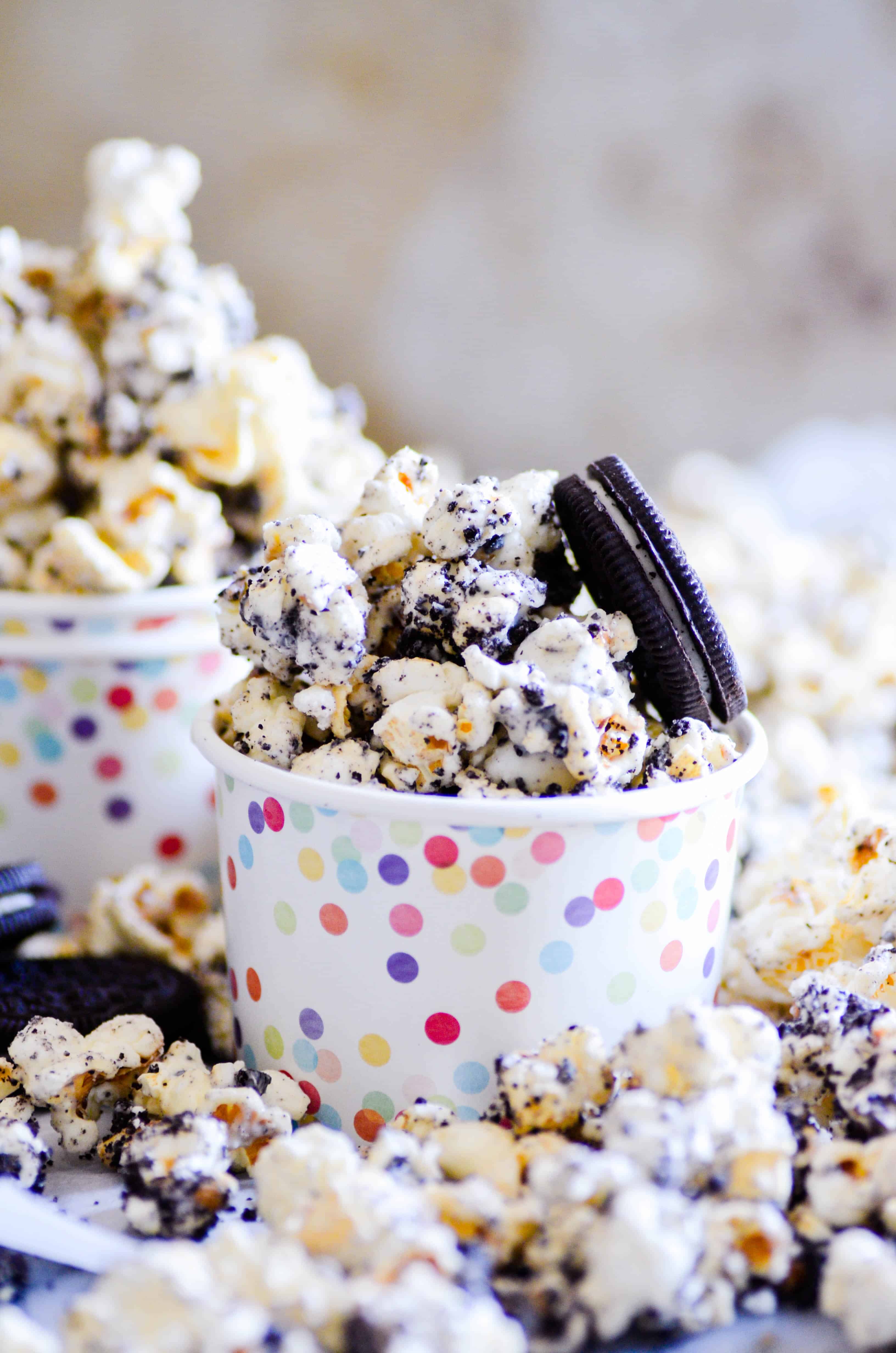 S’mOreo Popcorn Recipe posted by Staff Writer Pin Share Tweet Email Jump to RecipeKettle corn, Oreos, and marshmallows coated in white chocolate. This S’mOreo Popcorn recipe is an easy, no-bake recipe perfect for packaging, sharing with a crowd, or enjoying during a family movie night. This popcorn mix combines two of my favorite treats: S’mOreos (s’mores made with Oreos instead of graham crackers– TRY IT NOW!) and white chocolate covered kettle corn. I love using kettle corn in my chocolate covered popcorn mixes because the popcorn stays crisp and crunchy for a long time. It’s Just 3 Easy Steps to Make this S’mOreo Popcorn. HERE’S HOW: Add kettle corn, crumbled Oreos, and miniature marshmallows to a bowl. Mix in melted white chocolate. Spread the popcorn mix out and let it cool to harden. Easy peasy! A FEW THINGS TO NOTE ABOUT THIS RECIPE You could use regular popcorn in a pinch, but I really prefer using kettle corn for a candy coated popcorn mix. Even though I use a melting chocolate candy (more on that in the next bullet point) designed for coating, there’s still enough moisture in it to make the popcorn a little less crisp than I’d like it. It also shortens the shelf life quite a bit to use regular popcorn instead of kettle corn. The sugar coating on kettle corn keeps it crisp and crunchy for a while! I usually use Boom Chicka Pop kettle corn, because it’s easy! But you could also make your own Kettle Corn at home! I always use melting candy (like Wilton’s or Ghirardelli) for any recipes that involve coating something in chocolate. It melts easily with a low risk of seizing or burning, coats evenly, hardens quickly, and doesn’t melt immediately in your hands. You can generally find this kind of melting candy at Target (Ghirardelli), Walmart (Wilton’s and/or Ghirardelli), and Michaels or other craft stores (Wilton’s). Be sure to spread the popcorn out on a nonstick surface like parchment paper or a silicone mat. This will make it much easier to transfer to a serving bowl or into gift bags. CHECK OUT MY BOOK, PARTY POPCORN. Continue to Content S'mOreo Popcorn Yield: 6-8 servings Prep Time: 10 minutes Total Time: 10 minutes Kettle corn, Oreos, and marshmallows coated in white chocolate. This recipe is an easy, no-bake recipe perfect for packaging, sharing with a crowd, or enjoying during a family movie night. Print Ingredients 10 cups kettle corn 10-12 ounces white chocolate candy melts 1 cup crumbled Oreos 2 cups miniature marshmallows Instructions Place kettle corn in a large bowl. Be sure to remove any unpopped kernels! Add the crumbled Oreos and miniature marshmallows to the bowl as well. Melt the white chocolate melting candy according to the directions on the package. Stir until smooth and pour over the popcorn mixture. Gently stir with a spatula to mix and coat everything in the candy coating. Spread the popcorn on a large sheet of parchment or a silicone baking mat. Let cool for 10-15 minutes to dry and harden before serving or packaging. Notes NUTRITION INFORMATION: calories 594 | Total Fat 28 g | Saturated Fat 19 g | Total Carbohydrate 82 g | Dietary Fiber 3 g | Sugars 61 g | Protein 3 g Nutrition information is approximated based on 6 servings. I calculated for 10 Oreos instead of 1 cup. Obsessed with Popcorn? Me too! CHECK OUT MORE OF MY POPCORN MIX RECIPES Classic Kettle Corn Ultimate Peanut Butter Popcorn Easy Caramel Corn AND DON’T MISS THESE!! EASY ICE CREAM COOKIE DOUGH CAKE TEXAS ROADHOUSE CINNAMON HONEY BUTTER OLIVE OIL BROWNIE COOKIES PB&J PANCAKES CHOCOLATE BREAD PUDDING WITH BUTTERSCOTCH GANACHE
