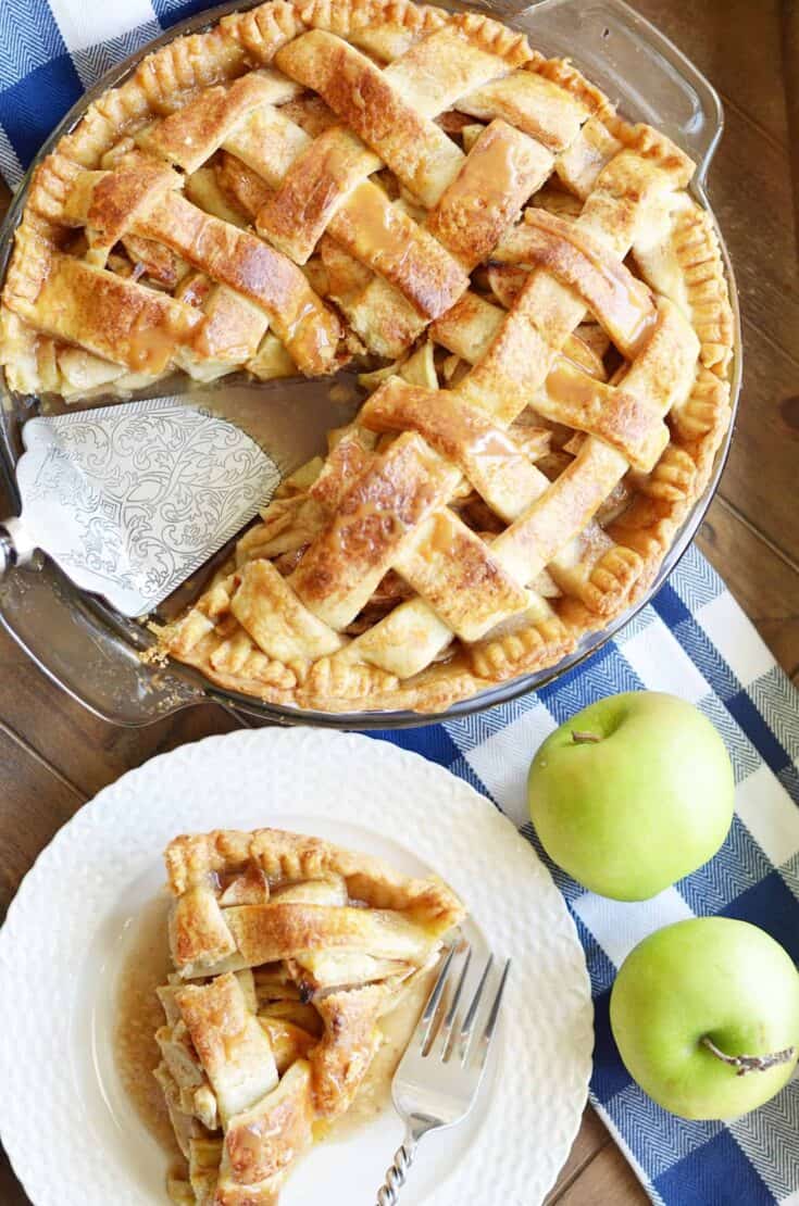Paula Deen’s Apple Pie Recipe posted by Staff Writer Pin Share Tweet Email Jump to Recipe Paula Deen’s Apple Pie Paula Deen’s Apple Pie is a deliciously classic recipe with a buttery homemade lattice top crust and brown sugar apples. Related Recipes: Collection: Delicious Holiday Pies Caramel Oreo Pie Nestle Toll House Chocolate Chip Pie Coconut Cream Pie Who doesn’t love a juicy apple pie with that carmel-y sweet crunch of flaky crust. So perfect yet so difficult to achieve just the right balance of apples, sweetness and crunch. Choosing your apples First, select apples for apple pie. It is important to choose firm apples that are less likely to turn to mush when baked. The best apples for pies are crisp and crunchy with a low water content. These would inclue Honeycrisp, Cortland, Granny Smith and Pink Ladies. As you’re shopping for apples, look for ones that feel firm and smell fragrant. And try to avoid apples that have ugly bruises or soft spots. Go for the freshest apples you can find. Even the highest quality apples can get mealy after being stored too long. Ingredients for Paula Deen’s Apple Pie brown sugar flour cinnamon nutmeg green apples, peeled and sliced lemon juice butter, cubed unbaked pie crusts egg wash for brushing on crust Must-Read Tips First sweat your apple slices before using them in the pie filling. This will prevent a runny filling and a soggy crust bottom! Read this post to learn how. You know, using store-bought pie crust dough is fine. But if you want to make your own, here are my favorite recipes by comfort level with making pie crusts: Total Novice: No Rolling Press-in-the-Pan Pie Crust* Beginner: Easiest All-Butter Pie Crust Intermediate: Buttermilk Pastry Pie Crust Experienced: Classic 2-Pie Crust Recipe *You’ll need to turn this recipe into a Dutch Apple Pie if you opt to use the Press-in-the-Pan pie crust, since this recipe does not make dough that rolls out easily. Have no fear– it’s easy! Simply replace the second crust that goes on top with a yummy crumble (use the crumble from this recipe) and adjust the baking time and temperature to: 60 minutes at 350°F. Place foil over the crumble topping if it gets too brown during baking. What does it mean to “Sweat” Apples? The process of sweating apples simply means to reduce the amount of juice in the apple slices intended for pie. You can easily draw the juice out of the apple slices by coating them in sugar and lemon juice and allowing them to sit for at least an hour at room temperature. Then you’ll see the juice has gathered at the bottom of the bowl (you can use this juice later to make cider or syrup!), and you can proceed to use the slightly dehydrated apples for a pie filling using any recipe. Continue to Content Paula Deen's Apple Pie Yield: 8-12 slices Prep Time: 30 minutes Cook Time: 55 minutes Total Time: 1 hour 25 minutes Paula Deen's classic Apple Pie with a buttery homemade lattice top crust and brown sugar apples. Print Ingredients 3/4 cup brown sugar 1/4 cup flour 1 tsp cinnamon pinch of nutmeg 7 medium green apples, peeled and sliced 1 tbsp lemon juice 3 tbsp butter, cubed 2 unbaked pie crusts egg wash for brushing on crust Instructions Preheat oven to 375ºF. Mix together the brown sugar, flour, cinnamon, and nutmeg. Place the apple slices in a large mixing bowl. Toss with the dry ingredients mixture to coat. Press a pie crust into a 9-inch pie dish. Fill with the apple mixture. Drizzle the lemon juice over the apples. Sprinkle the cubed butter over top as well. Place the second pie crust over the filling (you can make a lattice top or simply cut slits to vent the steam). Press edges to seal. Bake for 55-60 minutes. Let cool before slicing. Helpful Related Posts Why and How to Sweat Apples for Pie Continue Reading Classic 2-Pie Crust Recipe After years of struggle, I finally perfected the Classic 2-Pie Crust Recipe. I picked up a few tricks along the way, and I'm sharing them with you in this post! Get the Recipe Buttermilk Pastry Pie Crust If you're like me, and the art of pie crust-making has eluded you... give this one a try! I like that it's a little softer to work with; I've found that it cracks less when I'm rolling it out. And I also like that I can skip the rolling part if I want and just use my hands to press it into the pie dish. Get the Recipe Easiest All Butter Pie Crust Continue Reading