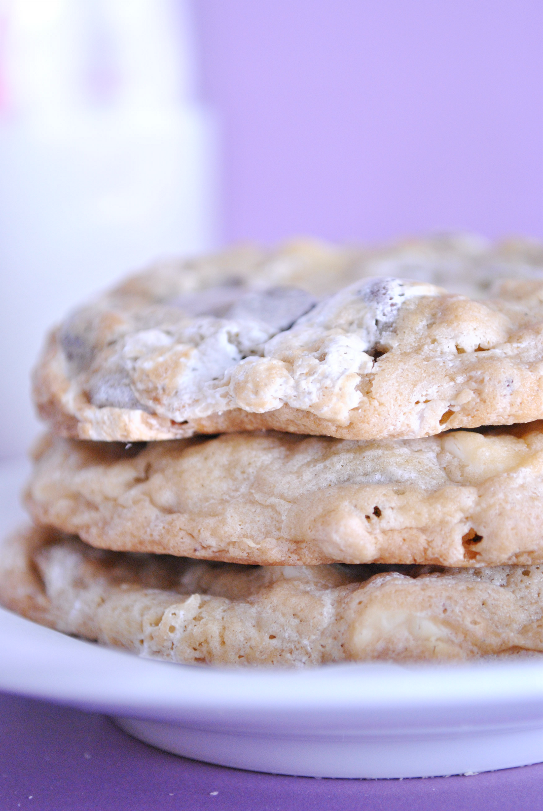Avalanche Cookies posted by Staff Writer Pin Share Tweet Email Avalanche Cookies, inspired by the Avalanche Apple, covered in white and milk chocolate, marshmallow cream, and rice krispies. My husband and I have been married for almost 6 years. And since we’ve been married, one of us has been a student. Every single year. We used to think we were poor college students who couldn’t afford to do anything. And then we had a baby. And now we’re actually poor college students who can’t afford to do anything. Not that we aren’t incredibly happy with our little family life. We are. But now we’ve got a little bit of a better perspective on the difference between being “poor college students” and being “poor college students with a little bit of disposable income at the end of the week.” BIG, BIG DIFFERENCE. And while we love the Netflix and Frozen CPK Pizza dates (with a baby monitor in the room) that we get to have now, we do spend some time reminiscing the fun date nights we had when we were richer “poor college kids.” One of our very favorite dates was to walk around an outdoor shopping center in Provo, the Riverwoods. We’d eat Chinese or Mexican, spend an hour at the book store, walk around holding hands and people watching, and then end the night with a chocolate covered apple from Rocky Mountain Chocolate Factory. The good old days. Mmmmmmm. Fortunately, I love Netflix and Frozen CPK. So I’m coping with the date changes pretty well. Even more helpful: these cookies. My favorite apple at Rocky Mountain was the Avalanche Apple. It was covered in white and milk chocolate, marshmallow cream, and rice krispies. So I’ve taken all of that and turned it into a cookie. Look out date night. The Avalanche is back. Avalanche Cookies 6029312 Ingredients 1/2 c butter or margarine 1/2 c shortening 1 c brown sugar 1/2 c sugar 2 eggs 1 tsp vanilla 1/2 tsp baking soda 2 1/2 c flour 1 c large milk chocolate chips 1 c white chocolate chips 1 c. rice krispies cereal 1/2 c. marshmallow cream Instructions In a stand mixer, mix the sugars, butter and shortening until smooth and creamy. Add eggs, one at a time. Add the vanilla, baking soda and flour. Mix in the chocolate and white chocolate chips at a low speed. Remove bowl from stand mixer. Fold in the rice krispies cereal with a wooden spoon or firm rubber spatula. Cut in the marshmallow cream with a firm rubber spatula– but don’t mix into the batter. Spoon onto a parchment lined baking sheet by heaping tablespoons, allow room for spreading. Bake at 375º for 9 minutes. Allow to cool on baking sheet before removing to wire rack.