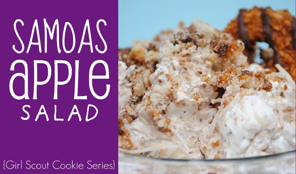 Samoas Apple Salad posted by Staff Writer Pin Share Tweet Email This Samoas Apple Salad is so great. So easy. And SO Samoas! And I do mean so samoas. As in: an entire box. I was super excited to do this Girl Scout Cookies series, but I was also a little afraid that I might run out of ideas trying to spread out one cookie over an entire week. SO. NOT. THE. CASE. If anything, I can’t get my brain to stop thinking GS Cookies. Ever. It’s actually been kind of awesome. (a little sleep depriving, but awesome) If you ever have “bloggers block”, pick a theme to follow for a week– that should do the trick! Anyway. As promised: my extra post for Samoas Week….. You’ve probably heard of Snickers Apple Salad. I think that’s a pretty well-known thing, right? I tried it for the first time a couple of years ago. Ah-mazing. Love it. It’s the easiest thing ever, but I never make it. I sit there and think, “oooooh, remember that snickers apple salad?” And that’s about the extent of the thought/action process. The other day, as I was scanning Pinterest for recipes that I thought could be turned “Girl Scout Themed,” I ran across that Snickers Apple Salad recipe, and realized that Samoas would make an absolutely amazing substitute for the Snickers! I know I’m always right, but sometimes I surprise my self at HOW right I am. (My husband is somewhere fighting the unexplainable urge to roll his eyes right now.) This Samoas Apple Salad is so great. So easy. And SO Samoas! And I do mean so samoas. As in: an entire box. If you can’t part with the whole thing, half the recipe 🙂 I’ll understand. Samoas Apple Salad 6018192 Ingredients: 1 box Samoas (or Keebler’s Caramel Delights) 1 – 8 oz Cool Whip Lite 1 small box vanilla instant pudding 1 1/4 c. milk 5 medium apples (granny smith is best) Optional: chocolate syrup for drizzling, and toasted coconut for garnish Instructions: Whisk together the milk and pudding mix until thickened. Immediately whisk in the cool whip. Using the paddle attachment of a stand mixer, mix the pudding mixture and the cookies on high– so that the cookies are crushed up really well and incorporated. Core and dice the apples, add into the bowl. Rough chop remaining (reserving 1-2 for garnish) cookies, add into the bowl. Using a rubber spatula, mix until all ingredients are coated in the pudding mixture. Optional: garnish with crumbled cookies, toasted coconut, and a drizzle of chocolate syrup. Refrigerate until serving. More Samoas Recipes: Samoas Cookie Recipe Roundup Samoas Pudding Mousse Samoas Fudge Samoas Dip