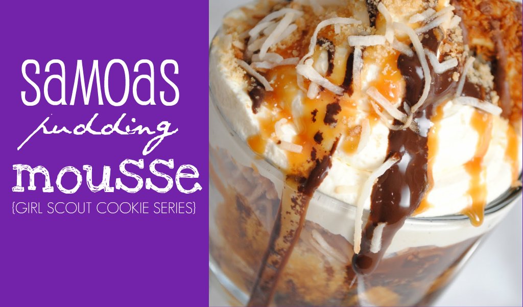Samoas Pudding Mousse Recipe posted by Staff Writer Pin Share Tweet Email This Samoas Pudding Mousse Recipe has been my hands down favorite this whole time. Hope you enjoy! I’m so excited about the doing three weeks of Girl Scout Cookies! I mulled this over all weekend, trying to figure out how to fit in all of the recipes I wanted to do that were Girl Scout Cookie themed. In the end, I decided that each of my three favorite cookies were going to need their own week 🙂 Welcome to week 1: Samoas!! And since pudding mousse is kind of my thang, and since I’ve just barely started posting it on the blog– I thought it would be a great way to start things up! Samoas Pudding Mousse. I made this one for the first time a couple of years ago, and it’s been my hands down favorite this whole time. Hope you enjoy! (you will 😉 Samoas Pudding Mousse 6017742 Ingredients: 1 small box instant pudding, vanilla flavored 1 c. milk 1 small tub cool whip 1/2 – 1 sleeve shortbread cookie (like Lorna Doone) toasted coconut (amount according to preference) 1/4 c. (at least) caramel sundae sauce (more if you want a caramel coconut layer) chocolate sundae sauce or syrup (for drizzling in between layers) Instructions: Whisk together pudding mix, milk, and 1/4 c. caramel sauce. Then quickly whisk in the cool whip until fully incorporated. Set aside. Crush shortbread cookies in a zip top bag. Set aside. Toast coconut on stove top. This takes about 10 minutes, but once it starts to brown– it goes fast! Now mix together equal amounts of caramel sauce and coconut (ie, 1 cup coconut, 1 cup caramel sauce– this amount just depends on how much you like!)– reserve at least a tablespoon or two of each for garnishing. Layer the crushed cookies, the caramel pudding mousse, the caramel coconut, and the chocolate syrup (in a trifle dish, in jars, or even in a tupperware container to save for later!). Garnish with toasted coconut, caramel sauce, and chocolate syrup. Side note: I think this tastes it’s very best the next day– when the cookie crumbs have softened some and mixed with the caramel (which is better cold too). It’s great as soon as you make it, but for best results, give it a few hours in the fridge. Another side note: Instead of using caramel sundae sauce, you could just melt down krafts caramels according to the directions on the package, adding 5 additional tablespoons of water. This will make the caramel chewier and more samoas-like. Low/No Sugar Options: Sugar Free Fat Free instant pudding Reduced/No sugar caramel sauce (Smuckers, I think?) Reduced/No sugar chocolate syrup (I know Hershey’s makes some) Reduced Sugar graham crackers (instead of shortbread) Cool Whip Lite/No Sugar Other Pudding Mousse Recipes: Red Velvet Cheesecake Pudding Mousse Cookies and Cream Pudding Mousse Sundaes in a Jar More Samoas: Samoa Bars
