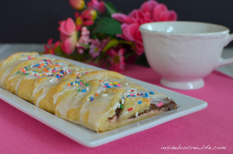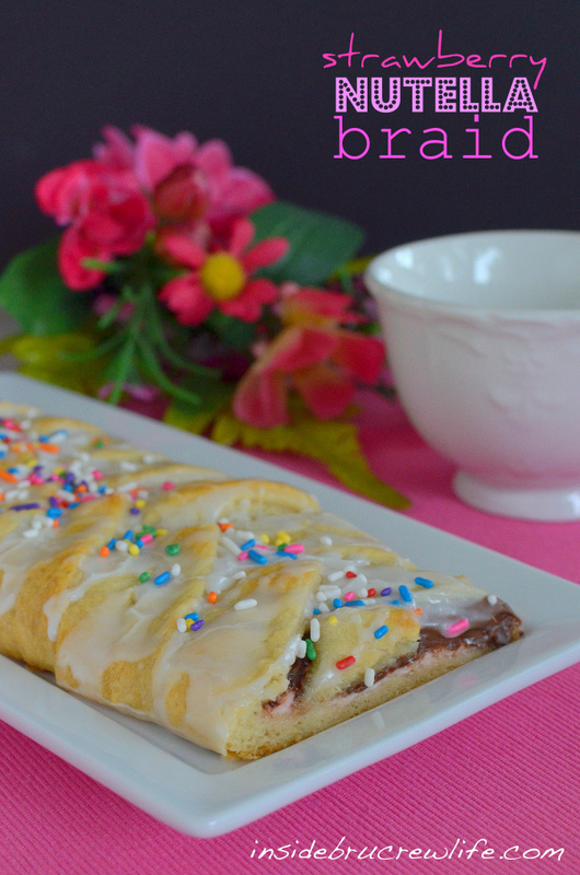 Strawberry Nutella Braid Recipe posted by Staff Writer Pin Share Tweet Email Jump to Recipe Hey, Swanky readers. My name is Jocelyn and I blog over at BruCrew Life. I am so excited to be here on Ashton’s blog. She has been super busy getting all the details together for the Online BlogCon, and I knew I wanted to help out any way I could. Ashton decided it was going to be a Pink Week to help raise awareness for breast cancer. I knew that was something I wanted to help promote. My own mom battled and survived breast cancer at the age of 29. I am very thankful for all the research and money that people have donated over the years for cancer research, because my mom is able to be with us today. This summer we all got together and enjoyed a fun week at the beach. I am glad my mom is able to enjoy seeing all her grandchildren too!!! There are so many great foundations such as the Susan G. Komen foundation or different races in your area that benefit BCA. /br> Please consider donating to one of these, so more patients can share time with their families. And also depending on how old you are, consider going for a mammogram to keep yourself healthy. My mom was very young when she found out, and that means I have a greater chance of having it too. So I have had a few mammograms already to stay ahead of it. The test is fairly simple and doesn’t hurt, so there is no reason to not have it done. The goal is to catch it in an early stage so it can be removed without a fatality. I definitely want to be around to see my children grow up too. My mom doesn’t live very close to us, but if she did I would make her one of these delicious Strawberry Nutella Braids and we would enjoy a chat over coffee. Maybe the next time we get together, this will be on the menu. I know she is reading this too, so Mom, I love you:-) Continue to Content Strawberry Nutella Braid Print Ingredients 1 can crescent rolls (8 oz.) 1/4 c. strawberry cream cheese 1/4 c. Nutella spread 1/3 c. powdered sugar 1 tsp. milk sprinkles Instructions Roll out the crescent rolls and press together the seams. Spread the cream cheese down the center of the rolls, staying about two inches from each side. Carefully spread the Nutella on top of the cream cheese. Using a sharp knife, make cuts about 1 1/2 inches apart along both sides of the rolls, stopping about a 1/2 inch from the filling. Alternately cross the strips on either side across the filling. Tuck the end under and press to seal. Bake at 375* for 12-14 minutes. Let cool. In a bowl, combine the powdered sugar and milk. Drizzle over the braid and top with sprinkles. Cut into 10 - 12 slices. Thank you so much Ashton for letting me be a part of your Pink Week. I am so happy to be able to help you out!!! And everyone else, come on over to Inside BruCrew Life for a weekly dose of sugar. You can also find me on Facebook, Pinterest, and Twitter.