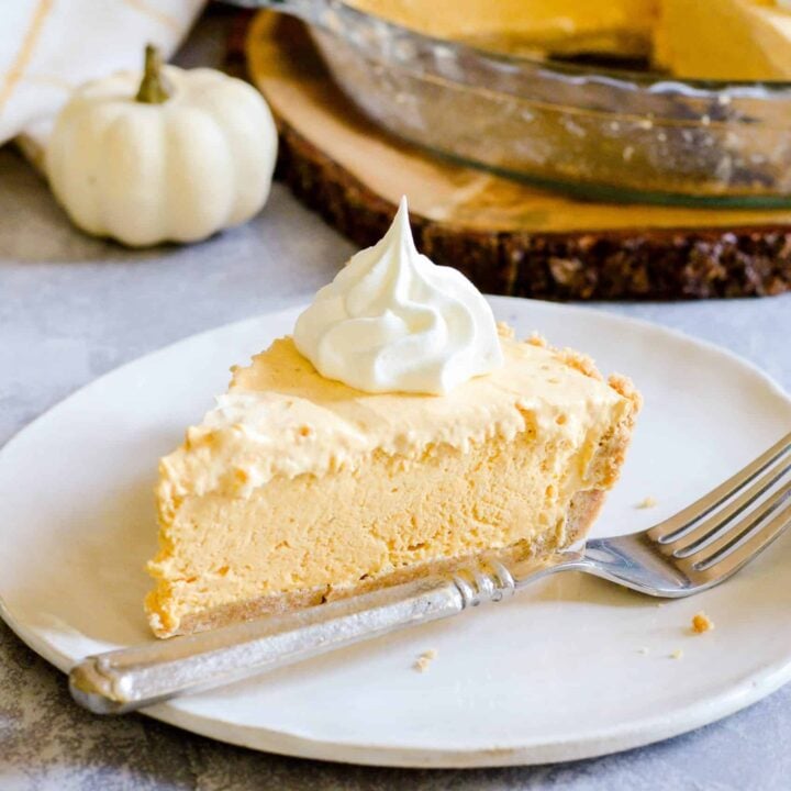 No Bake Pumpkin Cheesecake Recipe posted by Staff Writer Pin Share Tweet Email Jump to RecipeThis simple No Bake Pumpkin Cheesecake is made with just FOUR easy ingredients nestled inside a buttery, graham cracker crust. If you’re not a pumpkin pie person, this is the perfect substitute for your Thanksgiving dessert table! Related Recipes: Cheesecake Factory Pumpkin Cheesecake Cheesecake Caramel Pumpkin Cookie Cups Pumpkin Cheesecake Blossom Cookies Ingredients Needed for No-Bake Pumpkin Cheesecake cream cheese canned pumpkin sugar whipped topping (or my homemade stable whipped cream!) Recipe Tips & Notes ★ You can make this pie as easy/convenient to make as you! If you’re short on time, use a store-bought crust, cream cheese spread (no need to soften), and Cool Whip. Then pop it in the freezer for quick set up! ★ If you want to go the from-scratch route (which *I think* is worth the effort and not difficult at all)… make the homemade graham cracker crust, my Best Homemade Whipped Cream, and a brick of cream cheese that’s been softened to room temp. You can still stick this in the freezer to speed set-up, but make sure you serve it thawed! FAQ’s Why is my no bake cheesecake not firm? ✓ Cream Cheese: if you used reduced fat, low fat, or whipped cream cheese, your cheesecake will be too soft. A cream cheese spread will also make a softer cheesecake. I highly recommend using Philadelphia brand cream cheese (in brick form). ✓ Whipped Cream: if you decide to use whipped topping from a tub, it really needs to be Cool Whip brand. Every generic store brand I’ve ever tried to use is way too thin and won’t hold up in a no-bake cheesecake. ✓ Temperature: you won’t be able to cut this cheesecake until it has firmed up in the refrigerator. Since you brought the cream cheese to room temperature before mixing, it has to be chilled again in order to hold shape. Baked Cheesecake vs. No Bake Cheesecake: Which one is better? Really, this is comparing apples to oranges. They are two totally different desserts that happen to share the same name. A traditionally prepared cheesecake is made with eggs as the binding ingredient and is baked, which gives it a unique, creamy-yet-firm texture (yum!). A no bake cheesecake is really more of a creamy, mousse pie than a cheesecake. During the mixing process, the cream cheese is broken down with sugar and then mixed with whipped cream to give it a fluffy volume. Once chilled for several hours, the cream cheese somewhat returns to a firm state, and the pie can be sliced. Variations Crust Ideas Follow the directions for making an Oreo Crust in this recipe, and use that instead of the graham cracker crust. Because… duh. Skip the crust altogether, and serve the filling in individual bowls or ramekins as a mousse. Or layer it with brownie pieces and caramel sauce for an epic trifle. Pour the filling into a pre-baked Buttermilk Pastry Crust for a dessert that is reminiscent of an actual pumpkin pie. Continue to Content No-Bake Pumpkin Cheesecake Yield: 8-16 slices Prep Time: 10 minutes Total Time: 10 minutes Easy, creamy, delicious no-bake pumpkin cheesecake with a thick, buttery graham cracker crust. Easy to make, easy to eat! Print Ingredients graham cracker crust (homemade or store-bought) 8 ounces cream cheese, room temperature 1/2 cup sugar 1 cup canned pumpkin 8 ounces whipped cream (homemade or store-bought, see notes in post) dash of pumpkin pie spice Instructions Beat together the cream cheese and the sugar until smooth. Vigorously mix in the pumpkin. Continue to mix until no lumps remain. Fold in the whipped cream. Pour filling into the prepared graham cracker crust. Chill for 3-4 hours before serving. Nutrition Information: Yield: 8 Serving Size: 1 Amount Per Serving: Calories: 346Total Fat: 22gSaturated Fat: 11gTrans Fat: 0gUnsaturated Fat: 9gCholesterol: 50mgSodium: 201mgCarbohydrates: 35gFiber: 1gSugar: 21gProtein: 4g More Pumpkin Recipes Pumpkin Tres Leches Move over pie, there’s a new pumpkin superstar in town! This Pumpkin Tres Leches is amazing, and you just may find that you’d rather serve this at your holiday feast instead of pumpkin pie. Homemade pumpkin cake soaked in four kinds of milk and topped with whipped cream. Get the Recipe Pumpkin Cinnamon Roll Cake Pumpkin Cinnamon Roll Cake is a Fall twist on one of my all time favorite recipes-- this Cinnamon Roll Cake. The most classic flavors of Fall in one delicious and totally achievable AMAZING cake. Get the Recipe Pumpkin French Toast Casserole Recipe The smell of Fall is in the air! Especially if you put this Pumpkin French Toast Casserole in your oven. This simple, one-bowl recipe is a delicious and filling breakfast or dessert that will fill your kitchen with a warm and spicy Autumn aroma. Top it with whipped cream and caramel sauce or maple syrup. Get the Recipe Pumpkin Marble Cake Get the Recipe Pumpkin S'mores Parfaits Recipe Continue Reading Pumpkin Oreo Cheesecake Bars Recipe Continue Reading Pumpkin Cheesecake Blossom Cookies Recipe Continue Reading Pumpkin Chocolate Chip Cookie Chess Pie Recipe Continue Reading Pumpkin Roll Recipe Continue Reading Pumpkin Donut Muffins Recipe Continue Reading Pumpkin Chocolate Chip Cookies Recipe Continue Reading Pumpkin Cornmeal Pancakes Recipe Continue Reading Pumpkin Pie Recipe Continue Reading Pumpkin Boston Cream Pie Recipe Continue Reading Pumpkin Cheesecake Cookies Recipe Continue Reading Pumpkin Pudding Muffins Recipe Continue Reading Pumpkin Nutella Cupcakes Recipe Continue Reading Pumpkin Cupcakes with Cream Cheese Frosting Recipe Continue Reading Pumpkin S'mores Cupcakes Recipe Continue Reading Pumpkin Cheesecake Dip Recipe Continue Reading Pumpkin Pie Cinnamon Rolls Recipe Continue Reading Pumpkin Pie Bites Recipe Continue Reading Pumpkin Cream Pie Recipe Continue Reading Pumpkin Cornbread with Maple Cinnamon Butter Recipe Continue Reading Pumpkin Monkey Bread Continue Reading Pumpkin Chocolate Layer Cake with Cream C